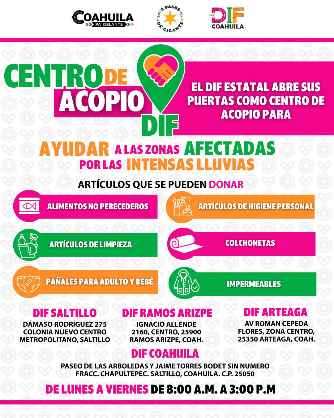 El Centro de Acopio DIF Coahuila se ubica en Paseo de las Arboledas y Jaime Torres Bodet, sin número, Fraccionamiento Chapultepec, en Saltillo, y permanecerá abierto de 8:00 a.m. a 15:00 p.m. para recibir: