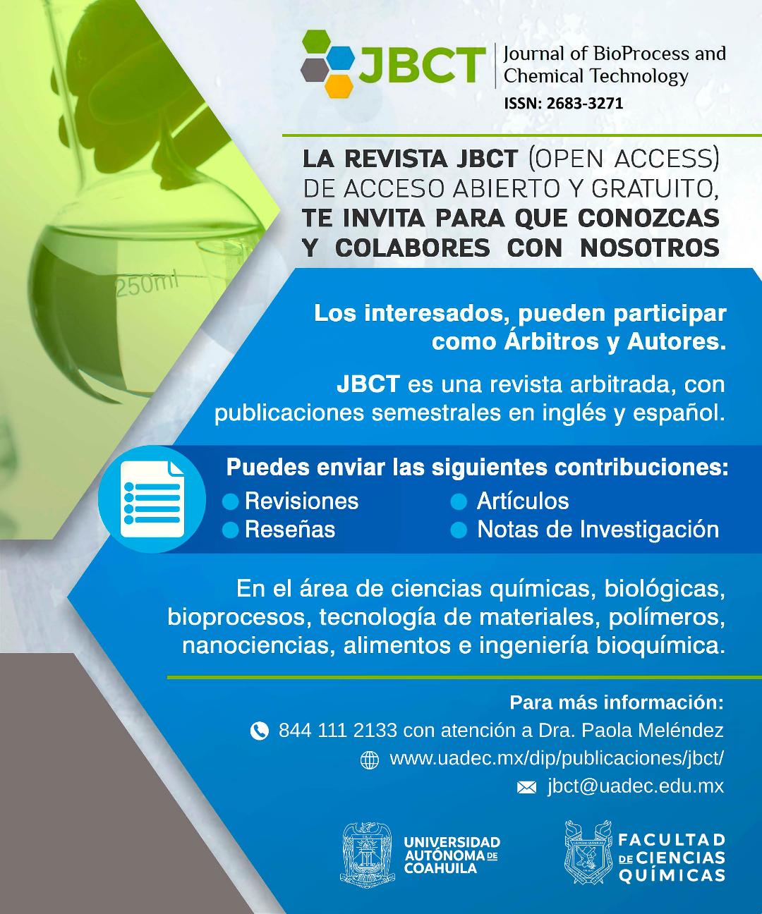 SALTILLO, Coahuila; A julio de 2025. La Universidad Autónoma de Coahuila, a través de la Dirección de Investigación y Posgrado (DIP) y la Facultad de Ciencias Químicas, invita a estudiantes, investigadores y académicos a colaborar como autores o árbitros en la revista Journal of BioProcess and Chemical Technology (JBCT), publicación de acceso abierto y gratuito con alcance internacional.