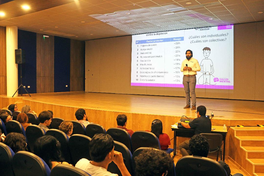 Durante la Jornada de Salud Mental "Mente de Lobo", se llevó a cabo una conferencia magistral a cargo del Dr. Ángel Daniel Alarcón Cortés, jefe de Enlace CONASAMA (Comisión Nacional de Salud Mental y Adicciones) de la Dirección de Salud Mental y Adicciones de la Secretaría de Salud de Coahuila, impartió la conferencia titulada "Diez factores protectores para la depresión".El especialista fomentó la reflexión individual y colectiva sobre la importancia de cuidar la salud mental y reconocer los elementos que contribuyen a prevenir la depresión; señaló que estos factores protectores, como el descanso adecuado, las relaciones interpersonales positivas, la práctica de ejercicio físico y una alimentación saludable, pueden marcar una diferencia significativa en el bienestar emocional de las personas.